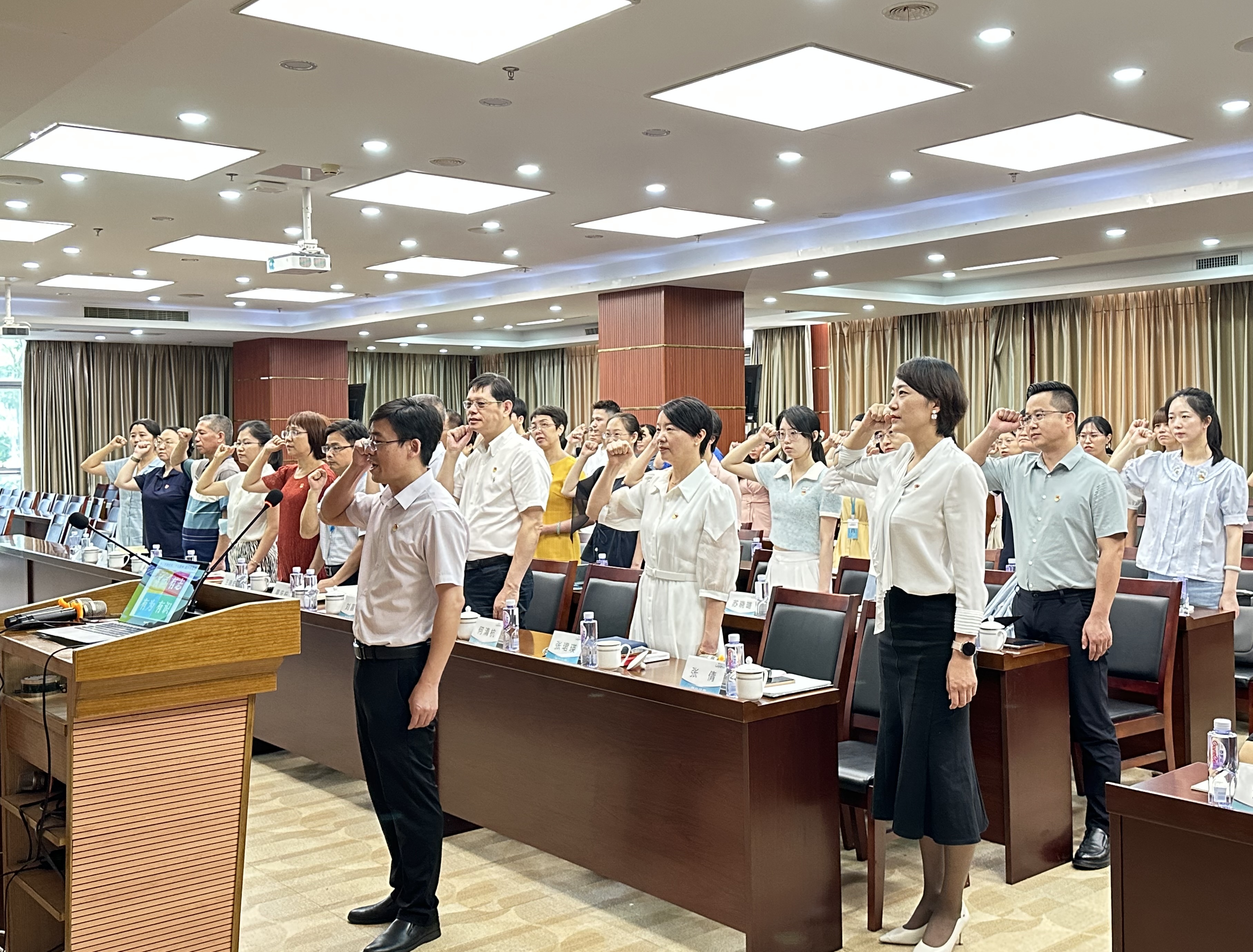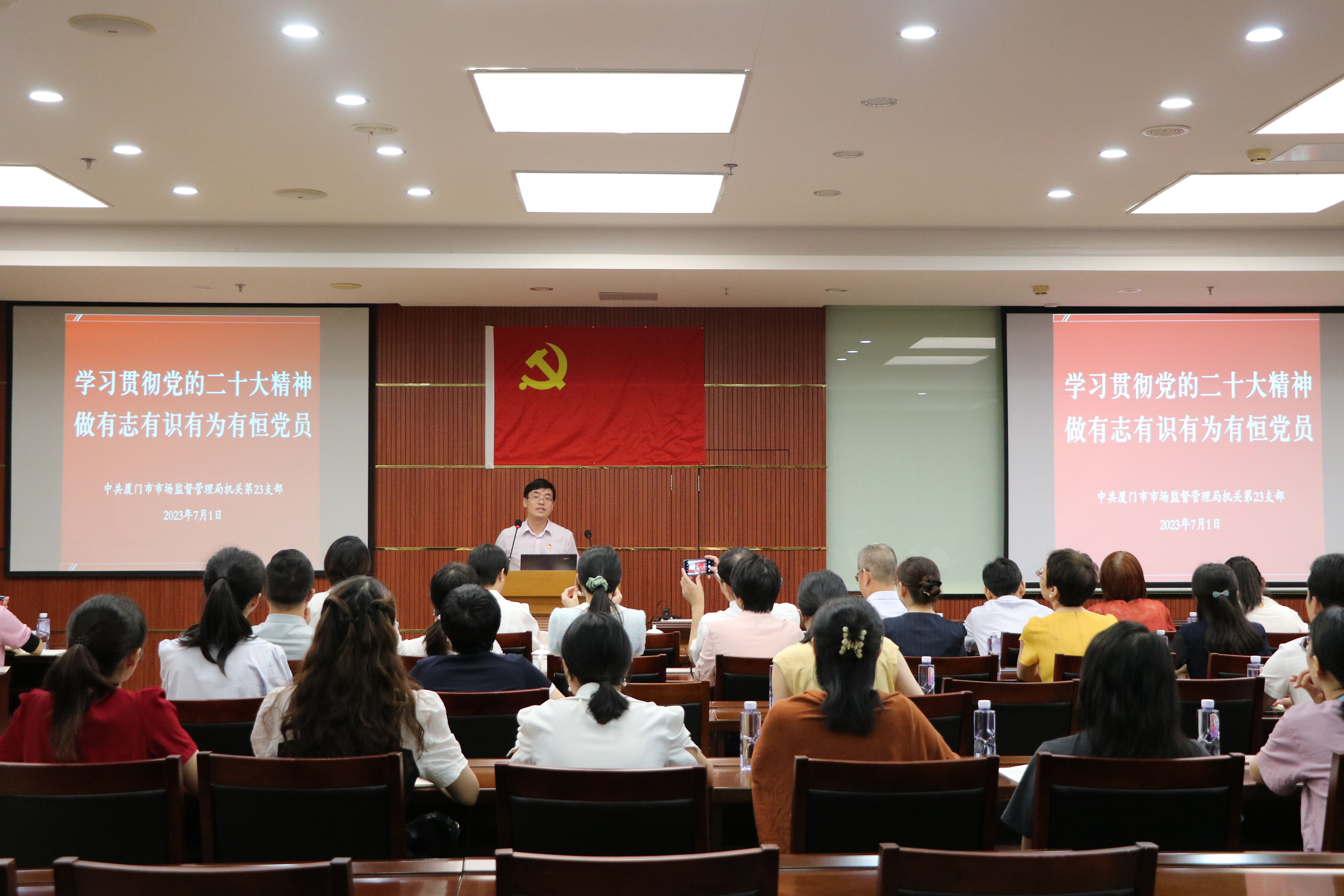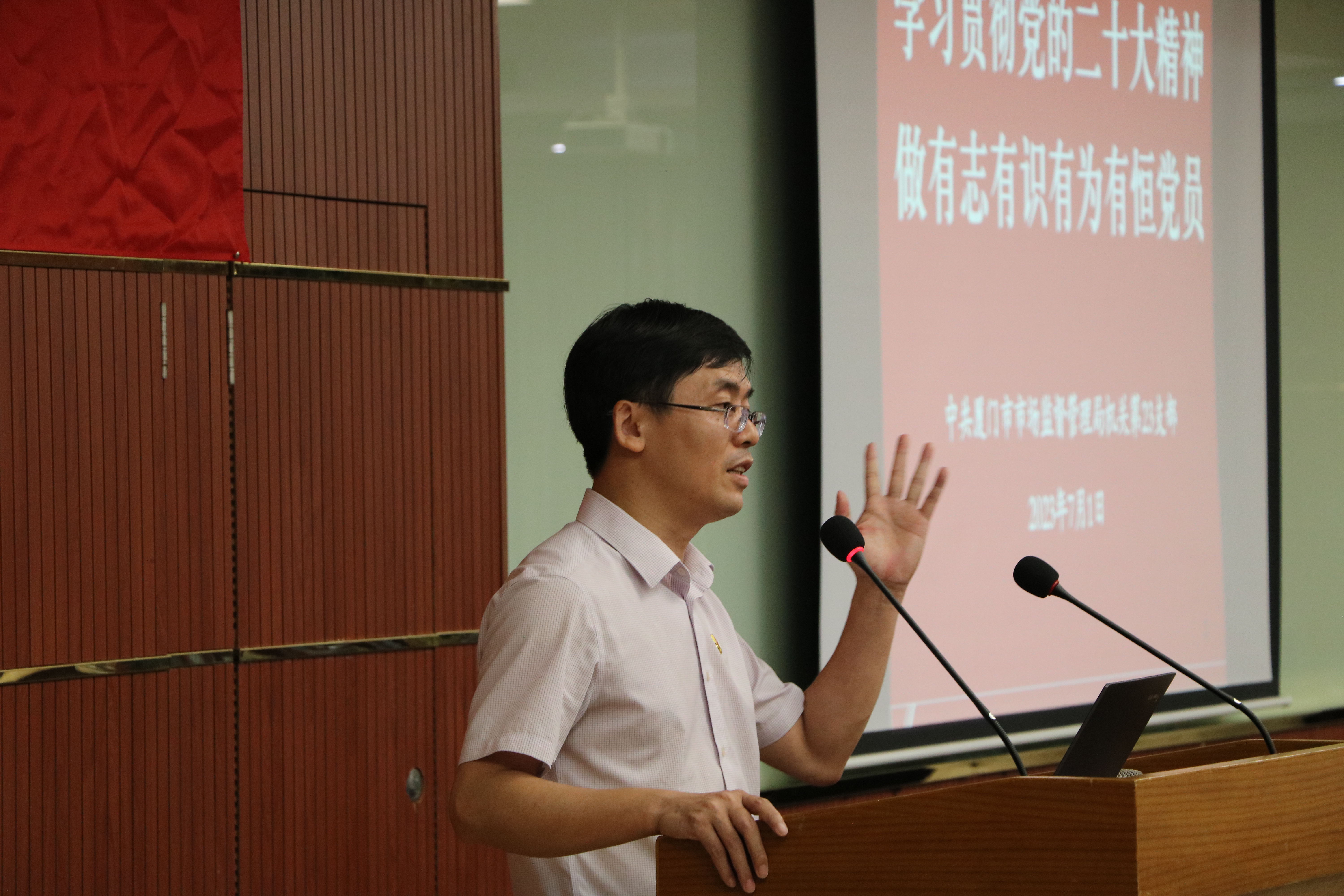 在這次聯(lián)建共建中,中共廈門市市場(chǎng)監(jiān)督管理局機(jī)關(guān)第二十三支部何清杭書記帶來了一堂《學(xué)習(xí)貫徹黨的二十大精神,做有志有識(shí)有為有恒黨員》的主題黨課授課前,何書記作為領(lǐng)誓員,脫稿帶領(lǐng)大家一起重溫入黨誓詞,全體黨員面對(duì)鮮紅的黨旗,莊嚴(yán)地舉起右拳,鏗鏘有力、擲地有聲地宣讀誓詞