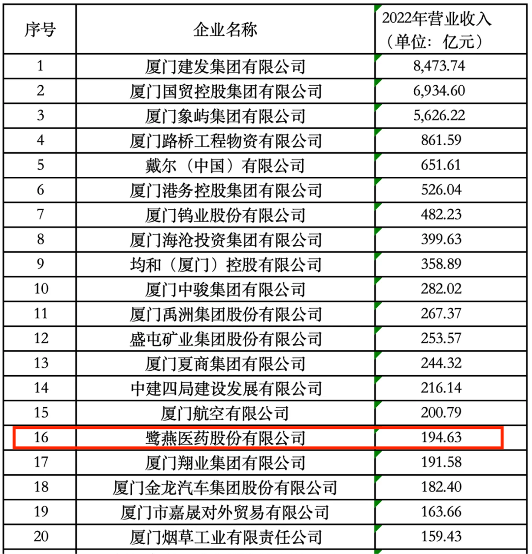 2023年11月25日,廈門(mén)企業(yè)和企業(yè)家聯(lián)合會(huì)發(fā)布2023廈門(mén)企業(yè)百?gòu)?qiáng)榜單,鷺燕醫(yī)藥股份有限公司榮列第16位!