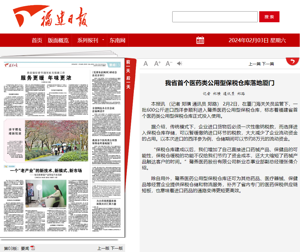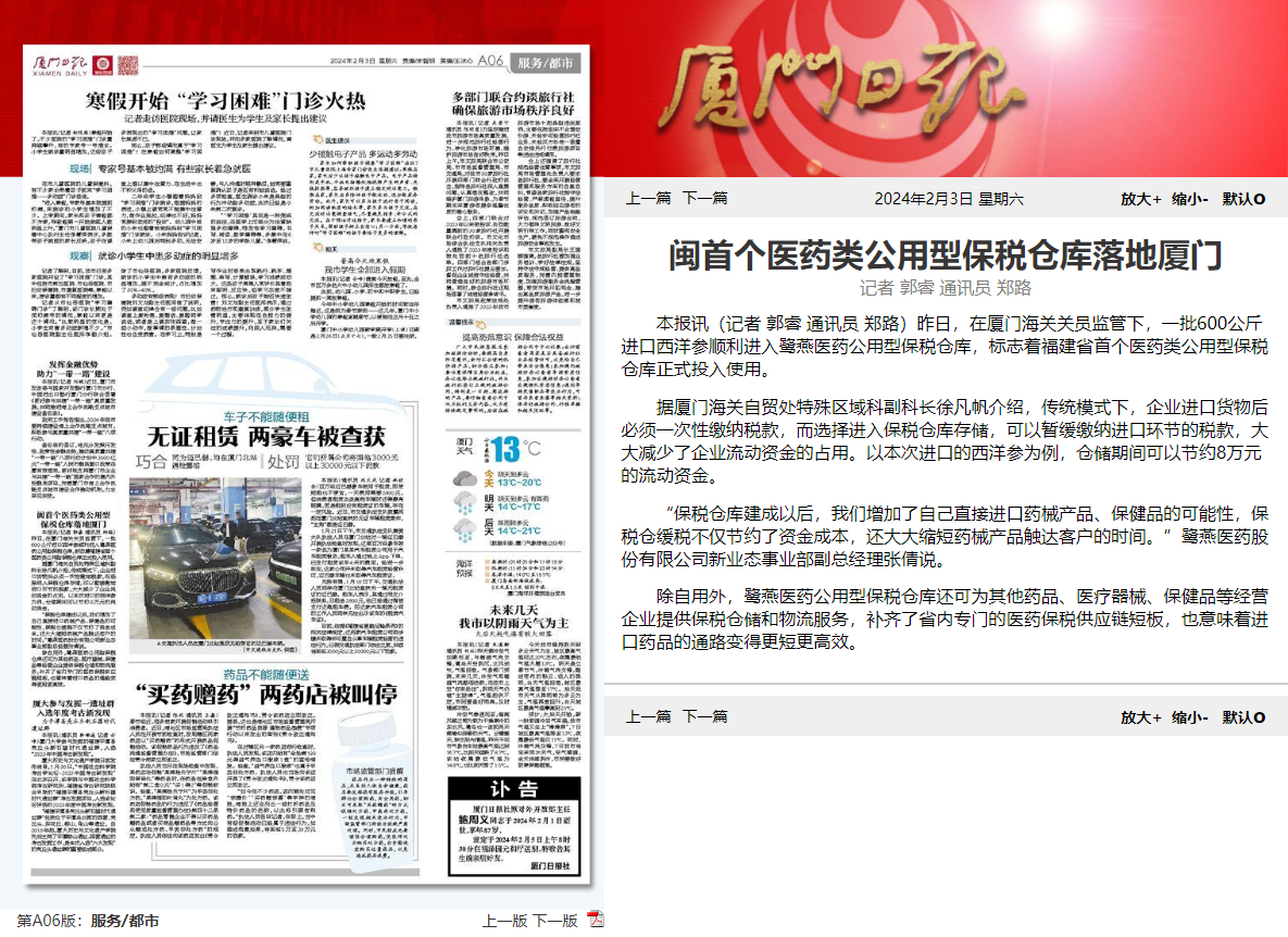 202422日,鷺燕醫(yī)藥公用型保稅倉獲批投用,《福建日報》《廈門日報》相繼報道相關(guān)新聞。鷺燕醫(yī)藥公用型保稅倉是福建省首個醫(yī)藥類公用型保稅倉庫,該保稅倉庫的投用,意味著廈門市乃至福建省補齊了區(qū)域內(nèi)專門的醫(yī)藥保稅供應(yīng)鏈物流服務(wù),也意味著廈門和福建進口藥品的通路變得更短,更為高效。